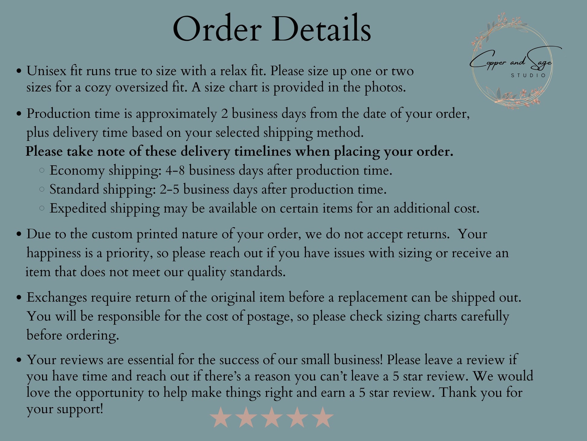 Please note that all items are custom made to order for each customer, therefore we do not offer returns/exchanges. If you have any issues or concerns, please absolutely reach out to us so that we can help.