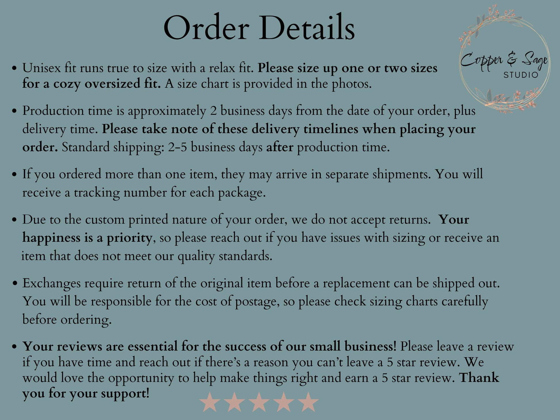 Each item is made to order rather than mass produced, helping reduce waste while ensuring your piece is created specifically for you. Production typically takes three to seven business days before shipment, and tracking information will be provided as soon as your order is on its way. During peak seasons or holidays, additional processing time may be required.