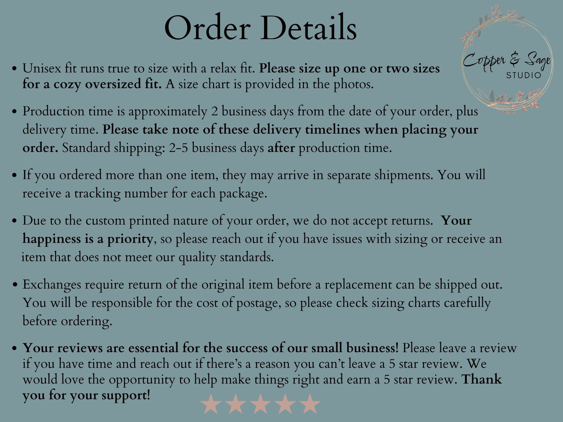 Because each piece is custom-made just for you, returns and exchanges aren’t available.