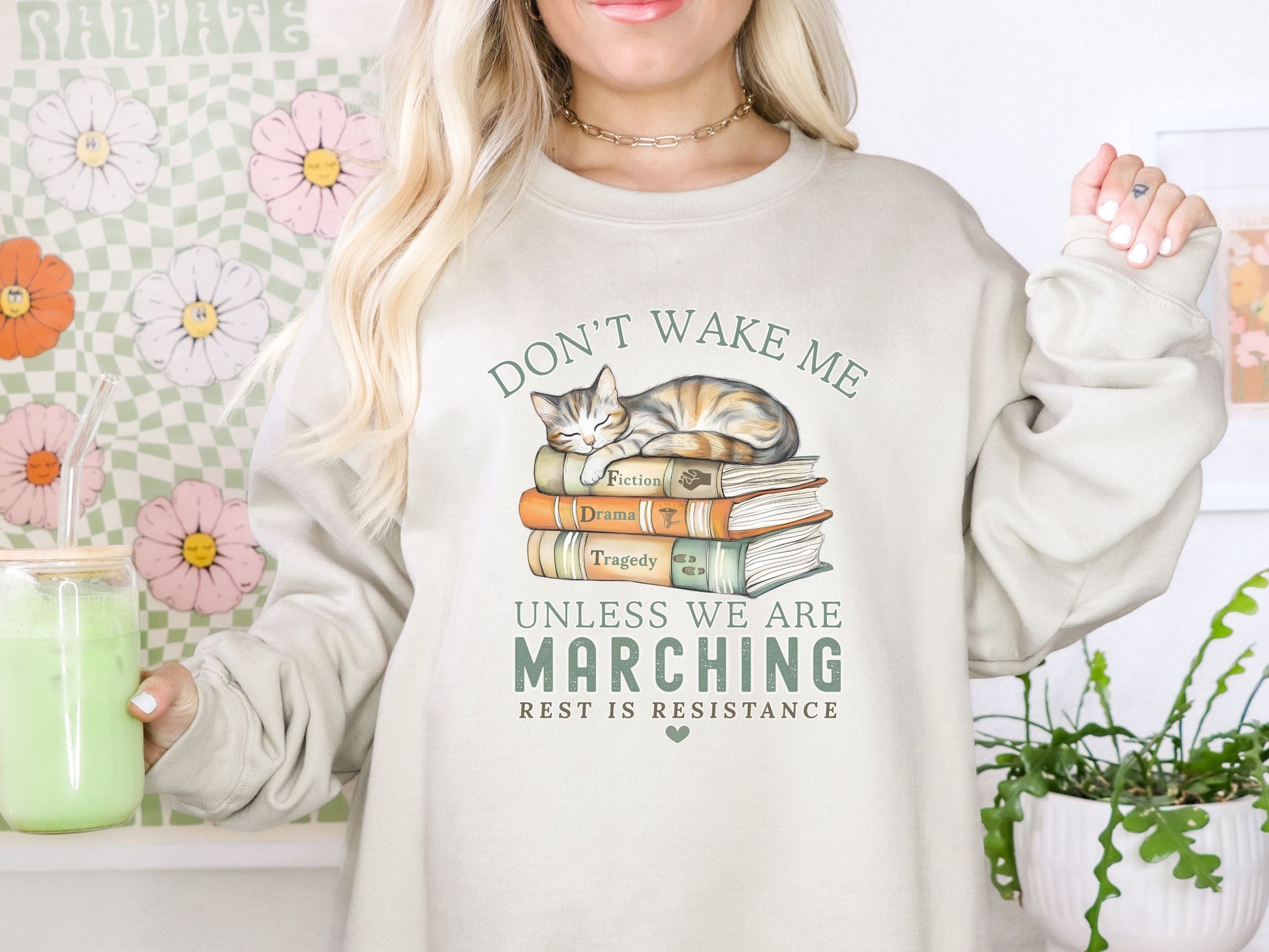 This soft, dreamy design is for the readers, introverts, and protest-style icons who know that rest is resistance. Featuring a sleepy cat atop a stack of FDT-coded books (Fiction, Drama, Tragedy—get it?), this design is a quiet rebellion wrapped in comfort. Perfect for progressive bookworms who protest hard and rest harder.