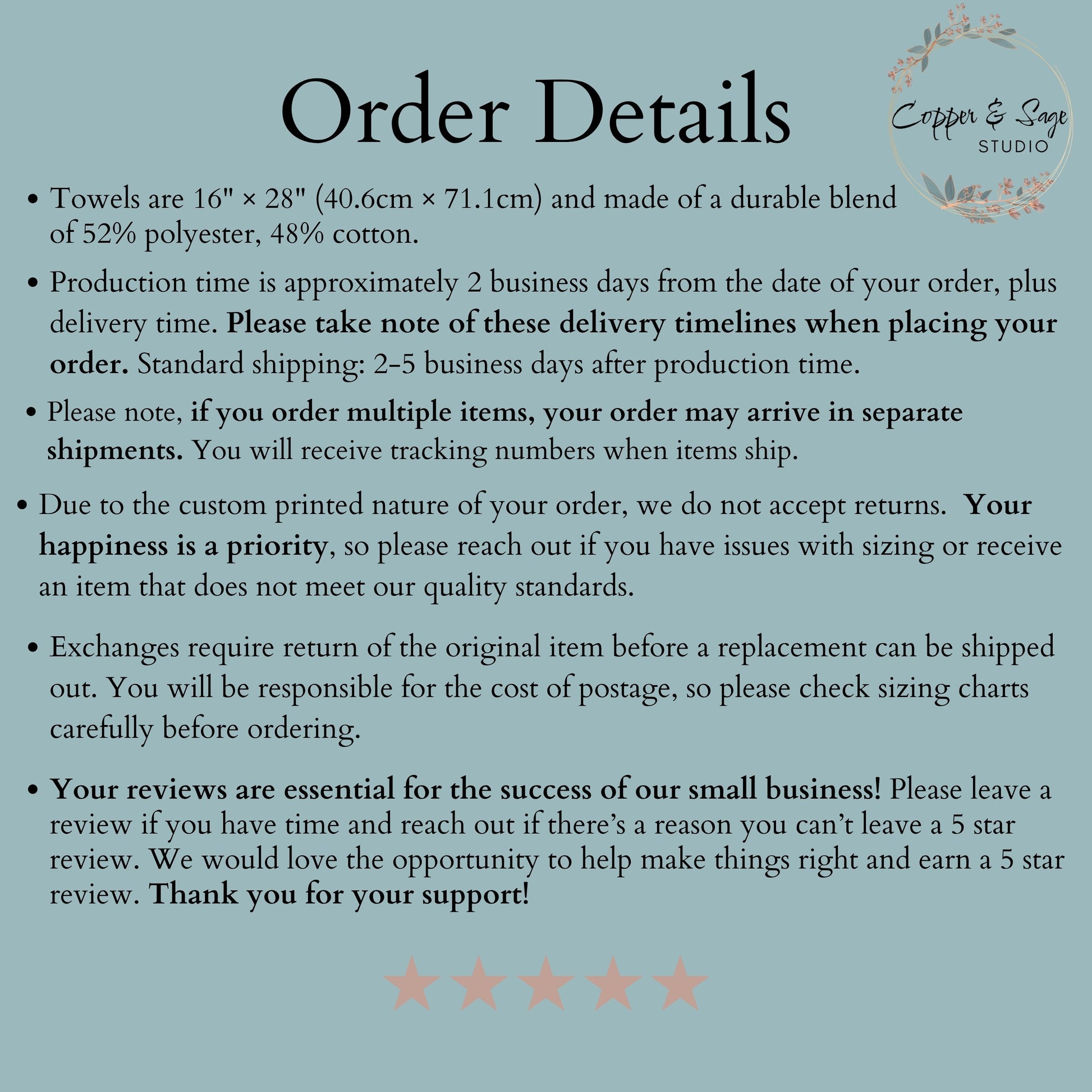 Please note that all items are custom made to order for each customer, therefore we do not offer returns/exchanges. If you have any issues or concerns, please absolutely reach out to us so that we can help.