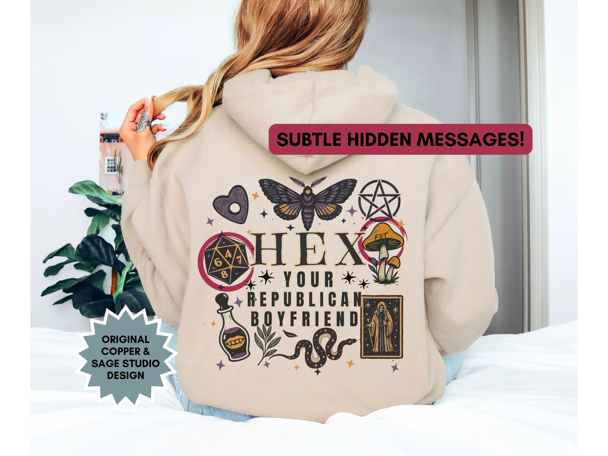 Cast a stylish curse with this “Hex Your Republican Boyfriend” tee—packed with magical icons and subtle rebellion. From the FDT mushroom to the 8647 d20, every detail is a nod to those in-the-know. Perfect for progressive witches, gamers, and goth girls who vote blue and hex red. Soft, bold, and made for casting shade and spells.