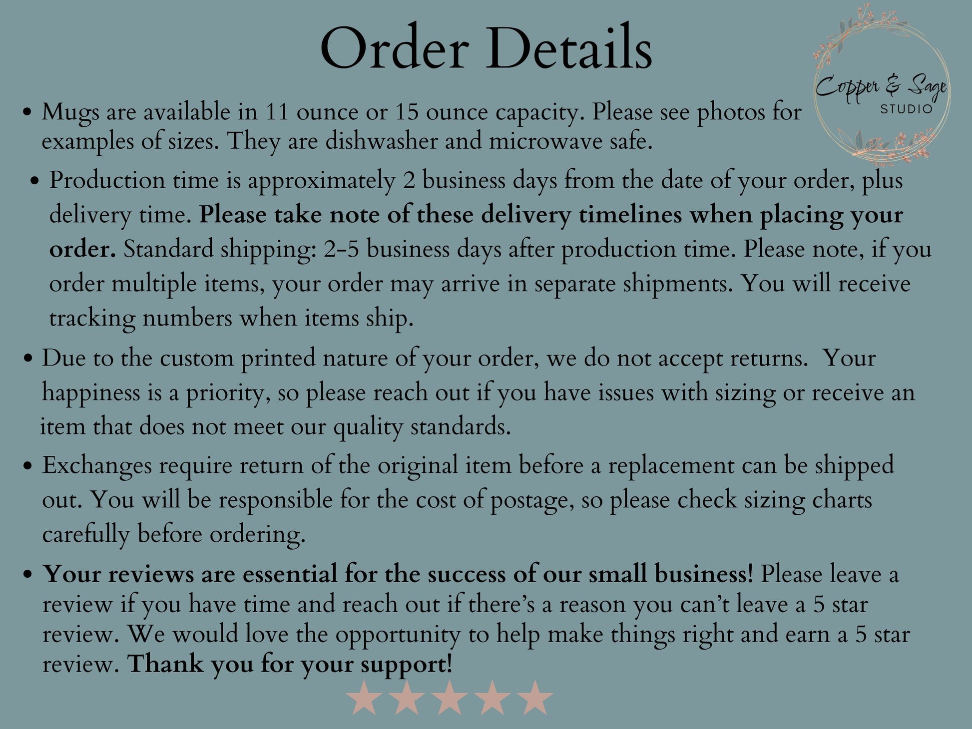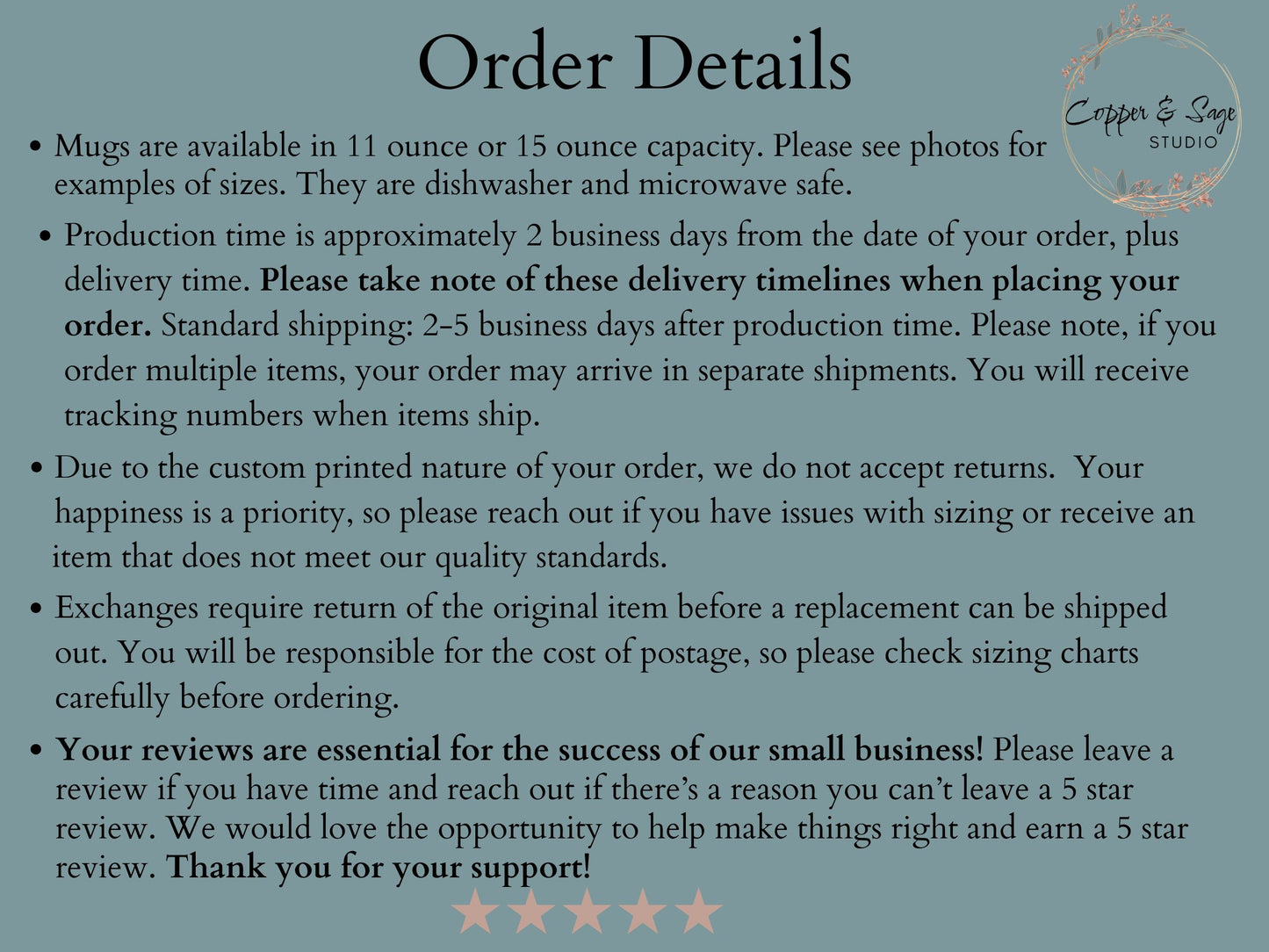Please note that all items are custom made to order for each customer, therefore we do not offer returns/exchanges. If you have any issues or concerns, please absolutely reach out to us so that we can help.